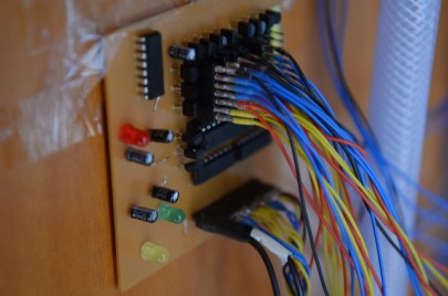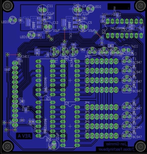 Die Schaltung, die am ESP32 angeschlossen ist, verteilt zum Beispiel die 9 angeschlossene Datenleitungen auf die 16 verbundenen Ventile und 8 RGB LEDs (3 Anschlüsse pro LED), um diese ansteuern zu können. Dies geschieht über Schieberegister, die die LEDs per PWM ansteuern. PWM steht für Pulsweitenmodulation: Hochfrequentes An- und Ausschalten der LEDs lässt diese so schnell flackern, dass menschliche Augen dies nicht erkennen können und je nach Länge der Zeit, die sie ein- bzw ausgeschaltet sind, dieses Flackern nur als Helligkeit der LED wahrnehmen lässt. Mit den 3 RGB Farben kann man die LEDs so in jeder beliebigen Farbe und Helligkeit leuchten lassen. Außerdem besitzt die Platine Spannungsregler, um die Spannungsversorgung der Ventile und LEDs zu gewährleisten. Wir mussten die Schaltung also erst entwerfen, sonst wäre dies nur mit dem ESP32 gar nicht erst möglich gewesen.