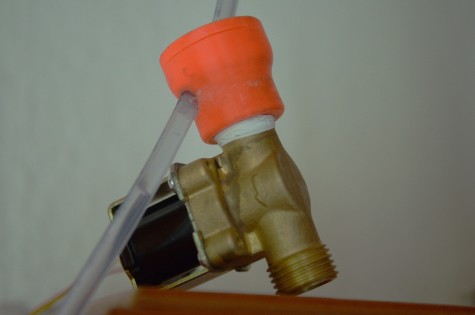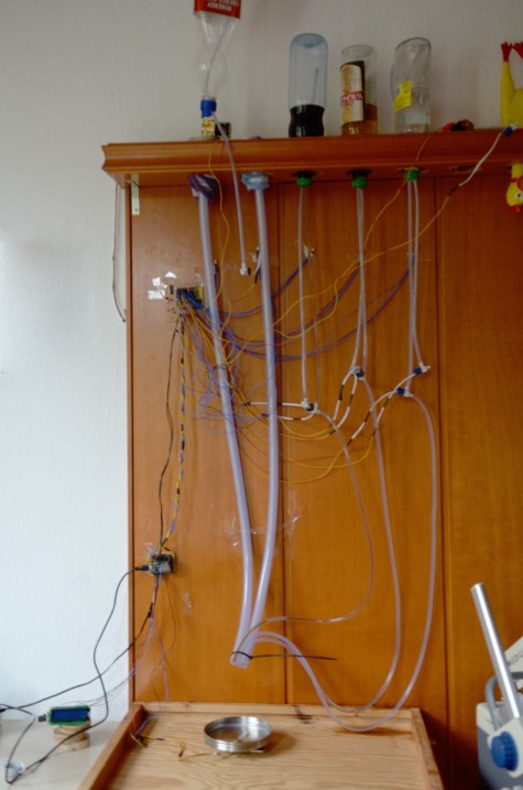Um Flaschen anschließen zu können, haben wir in die Deckel von Flaschen Löcher gebohrt und Schläuche mit Ventilen von dort aus verlegt. Jede Flasche hat jeweils ein Ventil für Luft und eins für Flüssigkeit. Für kohlensäurehaltige Getränke brauchten wir jedoch größere Schläuche, da die Kohlensäure in den kleinen Schläuchen an der Innenseite Blasen gebildet hat. Für größere Schläuche brauchten wir jedoch dann auch größere Ventile, die wir mit selbst gezeichneten und im FabLab der TU- Darmstadt (gerne mal besuchen) 3D gedruckten Adaptern bestückt haben, sodass die Schraubverschlüsse von Flaschen an die Ventile geschraubt werden konnten.