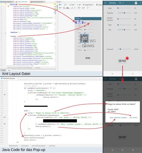 Für die Interaktion mit den Nutzern dagegen brauchten wir ein Interface, das jeder verwenden kann. Wir haben also eine App programmiert, mit der man seine Bestellungen abgeben kann. Auf dem Bild sieht man zum Beispiel den XML Code, der das Layout beschreibt für die allgemeine Oberfläche (XML wird in Android für das Design genutzt und beschreibt Elemente, die dann mit Java Code in der Oberfläche eingebunden werden und mit Funktionen versehen werden) und den Java Quellcode, der ein Pop-up erscheinen lässt, wenn man eine Bestellung abgegeben hat. Dieses Pop-up schauen wir uns nun näher an: es ist ein Alert Dialog, der mit einem Builder zunächst erstellt werden muss. In der ersten Zeile des Codes wird also als Erstes dieser Builder erstellt. Das erste Wort in Zeile 165 bezeichnet den Typ, von dem die Variable „a_builder“, also das zweite Wort, ist. Mit „=“ weist man dieser Variable einen Wert zu, in diesem Fall wird mit „new“ ein neuer Builder erschaffen („context“ einfach mal ignorieren). Es wird also die Variable vom Typ AlertDialog.Builder erschaffen, die a_builder heißt und auf den Wert eines neuen Builders gesetzt wird. In der folgenden Zeile wird als Erstes überprüft, ob beim Absenden der Bestellung eine Bestellmenge in Millilitern angegeben wurde. Dies geschieht über einen Schieberegler, eine Seekbar. Wenn dies nicht der Fall sein sollte, wird eine Fehlermeldung angezeigt mit einem Zurück-Button, der das Pop-up-Fenster schließt. Andernfalls wird eine Nachricht angezeigt, bei der man aufgefordert wird, seine Mischung zu überprüfen. Dazu wird der gewählte Inhalt aufgelistet (Erstellen der Liste hier nicht auf dem Screenshot drauf) und im Pop-up angezeigt. Zusätzlich besitzt das Pop-up zwei Buttons, einen zum Bestätigen, der die Nachricht an die Getränkemaschine übermittelt (geschwärzt) und einen, um zu dem vorherigem Bildschirm zurück zu kehren. Damit wurde der Inhalt des Pop-up aufgebaut und der Alert Dialog kann gebaut werden. Dies verhält sich ähnlich wie bei der Variable „a_builder“, nur wird hier mit .create() eine Methode aus „a_builder“ aufgerufen, die einen, den bisherigen Informationen entsprechenden, AlertDialog erschafft. Dem Alert Dialog wird der Titel, der zuvor je nach Zustand festgelegt wurde, gegeben und wird im Anschluss mit alert.show() angezeigt.